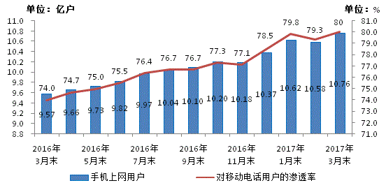 2016-2017年3月手機(jī)上網(wǎng)用戶和對(duì)移動(dòng)電話用戶滲透率情況